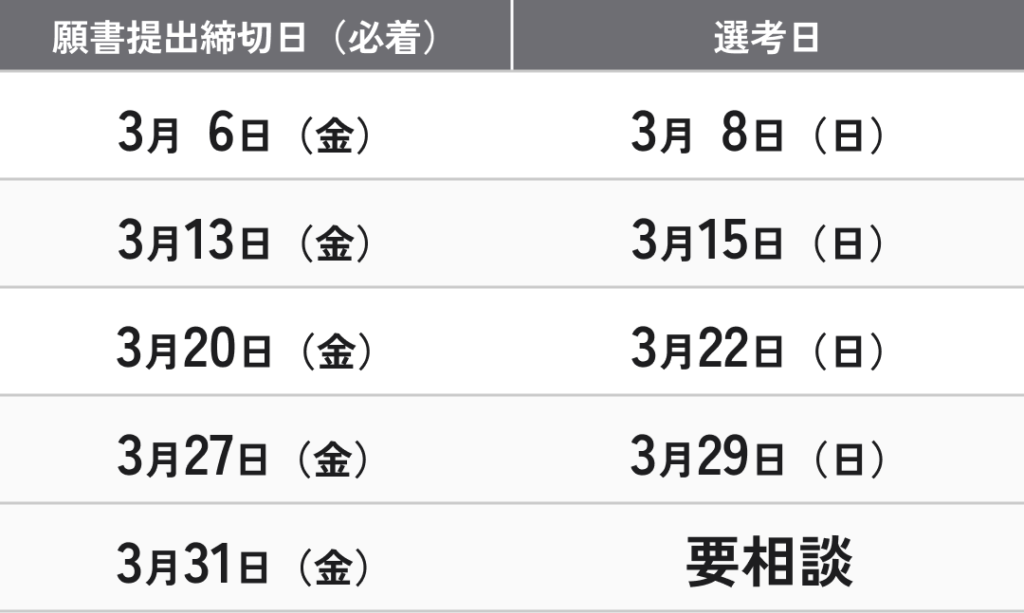 願書提出締切日と選考日は下記の通りです。